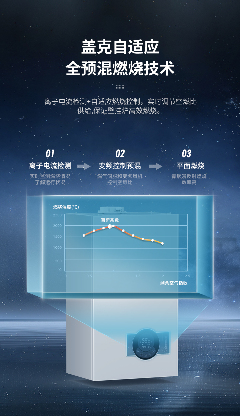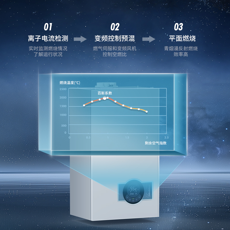 Benzi系列壁挂炉采用盖克自适应燃烧程控技术,有效解决了因空燃比失调,导致燃烧稳定性及效率下降的难题。盖克燃烧是基于高精度离子电流检测技术,实时精准地监测燃烧环境,并计算最优燃烧策略,调控宽频风机和伺服燃气组件工况,确保燃烧系统高效运行,热效率高达108%。