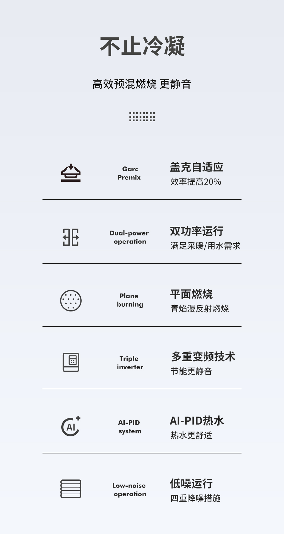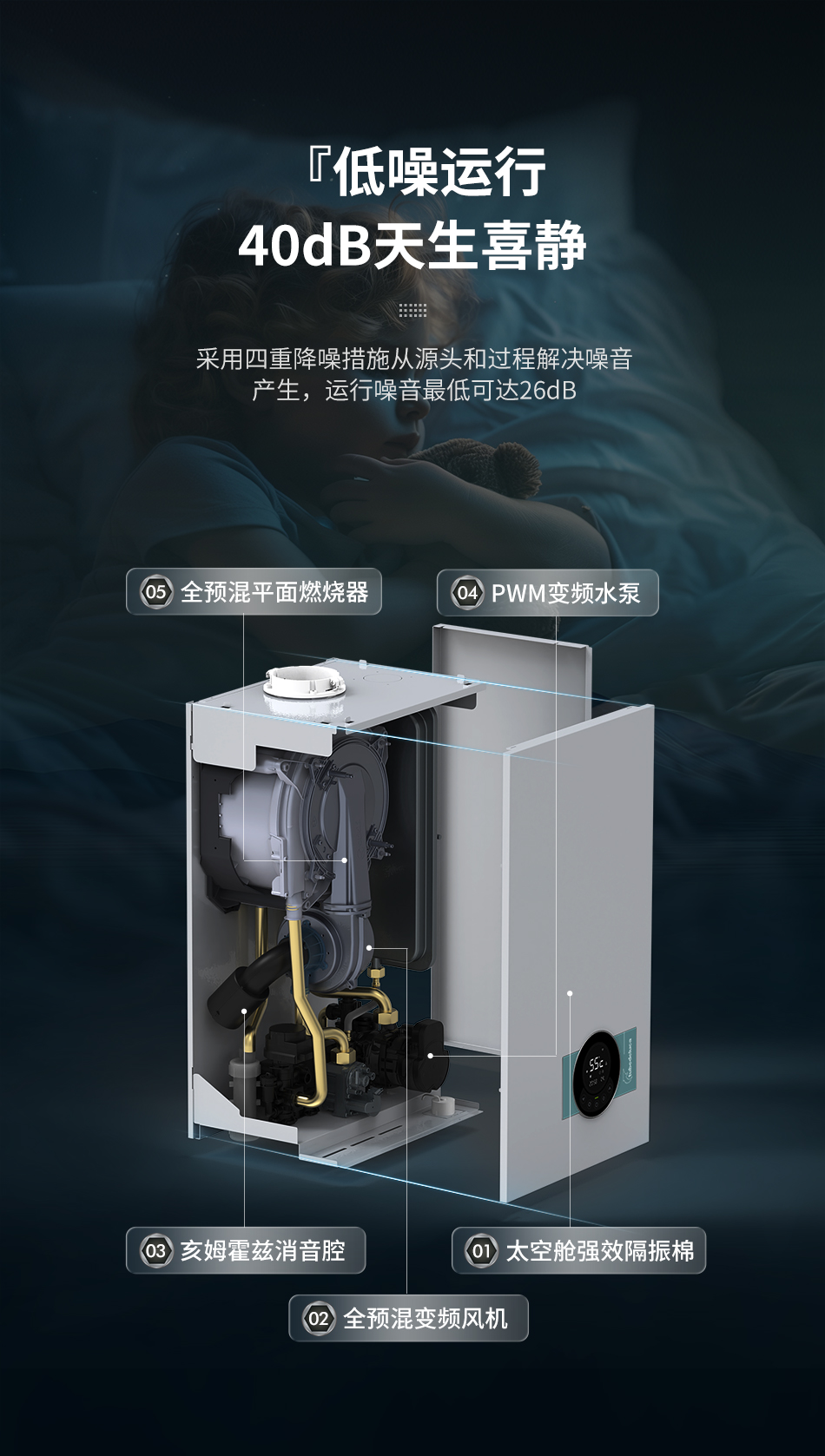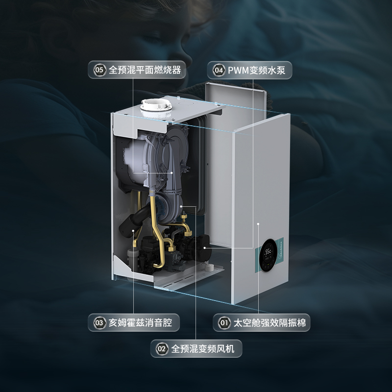 图本在降噪技术上取得了显著成果,特有亥姆霍兹消音腔强制改变声音传播路径消除进气噪音;宽频风机和PWM水泵可自动匹配最优转速运行噪音更低;采用陶瓷纤维燃烧器平面火焰分布均匀燃烧更静音;机壳内部采用太空舱隔音棉吸收阻隔噪音。