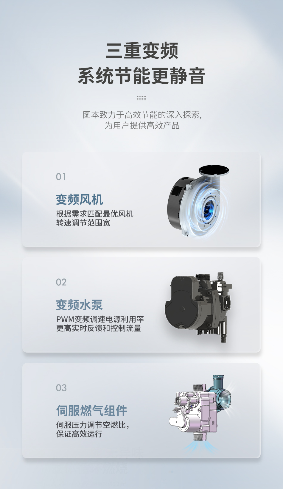 图本致力于高效节能的深入探索,在燃烧方向引入宽频风机和伺服燃气调节组件保证最佳空燃比高效全预混燃烧;在系统水利方向采用变频水泵调节水力平衡;在热需求方向通过对室外气候、室内温度、回水温度数据采集,并精准计算负荷需求;实现了燃烧/水利/热需求三者工况高效联动,而达到节能的效果。