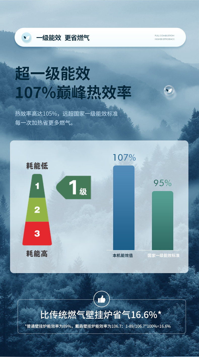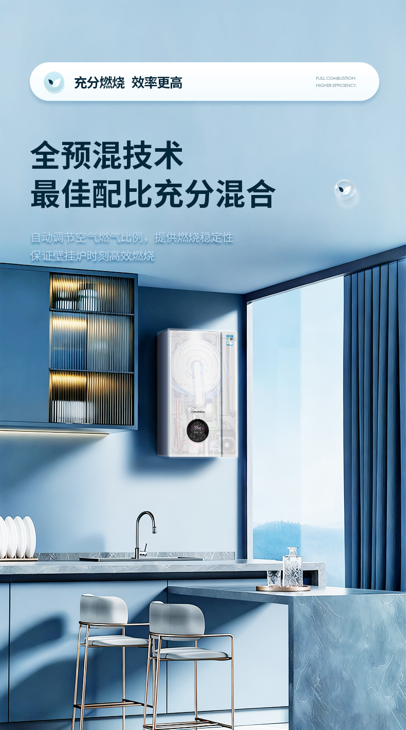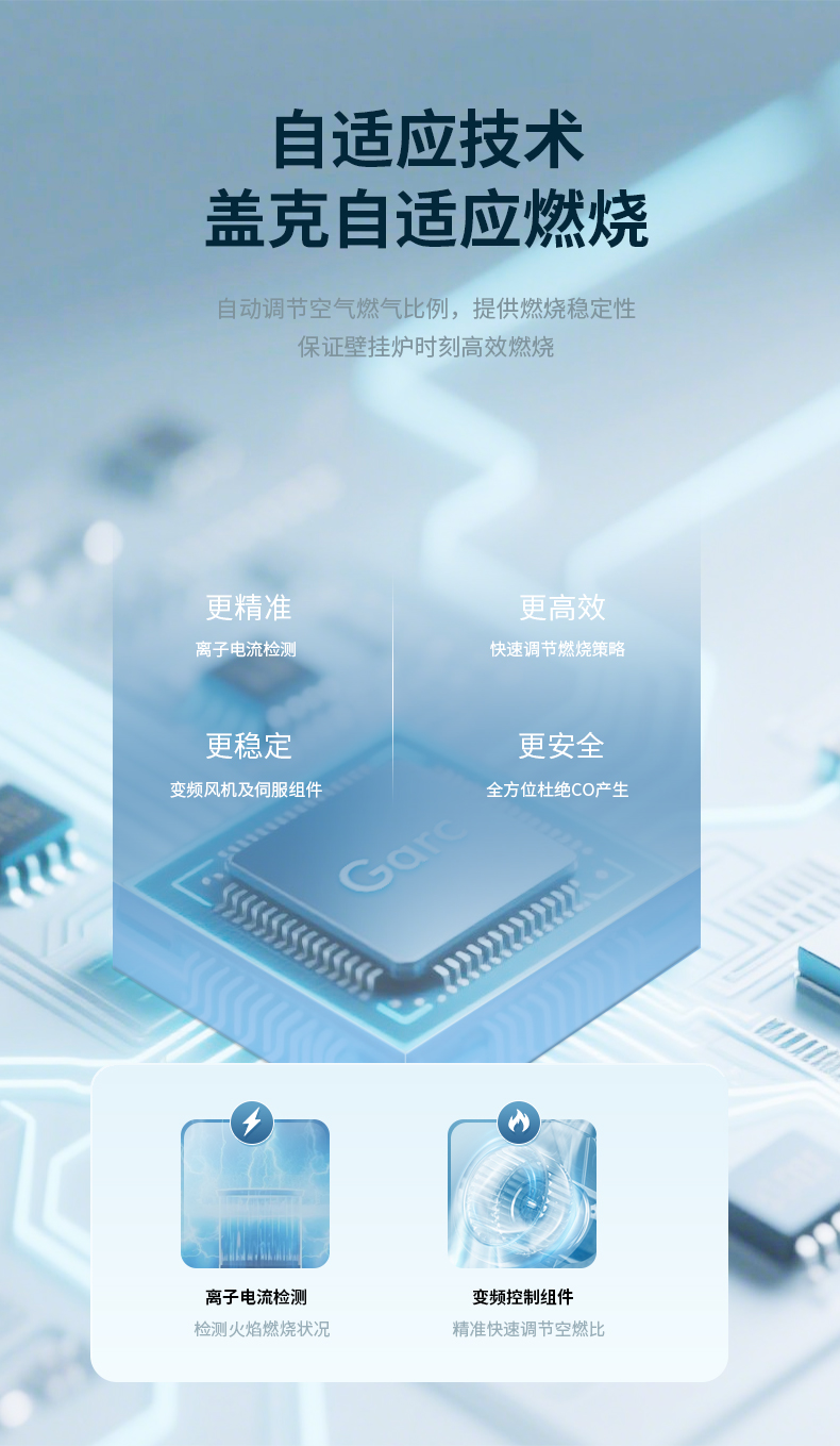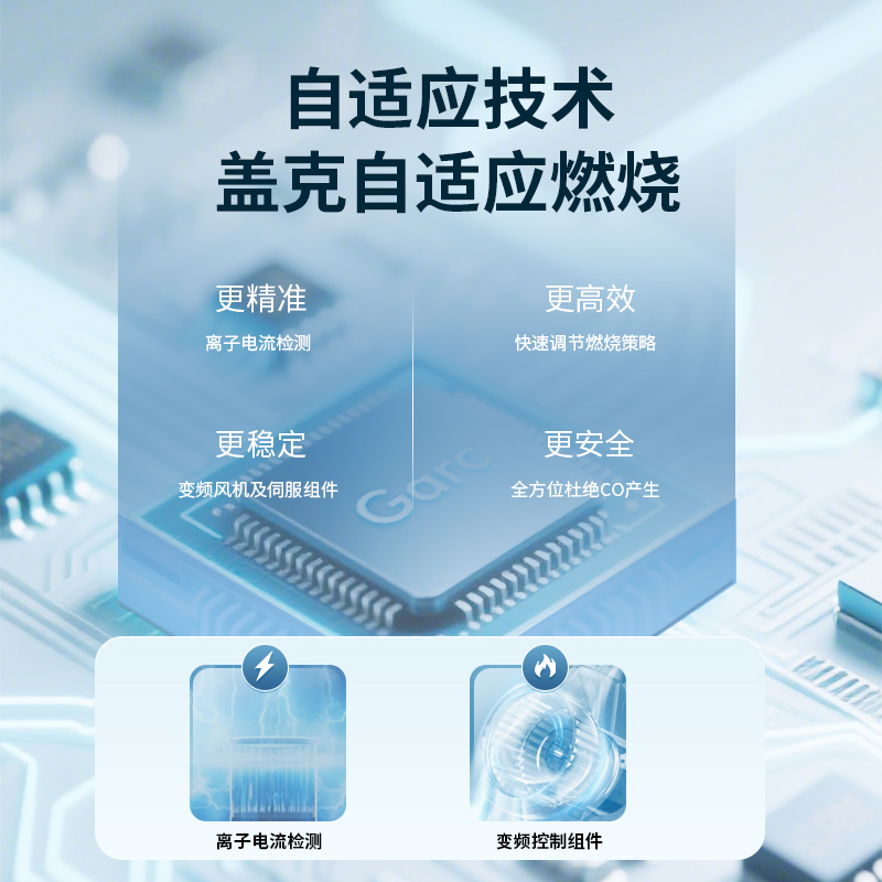 Benzi系列壁挂炉采用盖克自适应燃烧程控技术,有效解决了因空燃比失调,导致燃烧稳定性及效率下降的难题。盖克燃烧是基于高精度离子电流检测技术,实时精准地监测燃烧环境,并计算最优燃烧策略,调控宽频风机和伺服燃气组件工况,确保燃烧系统高效运行,热效率高达108%。